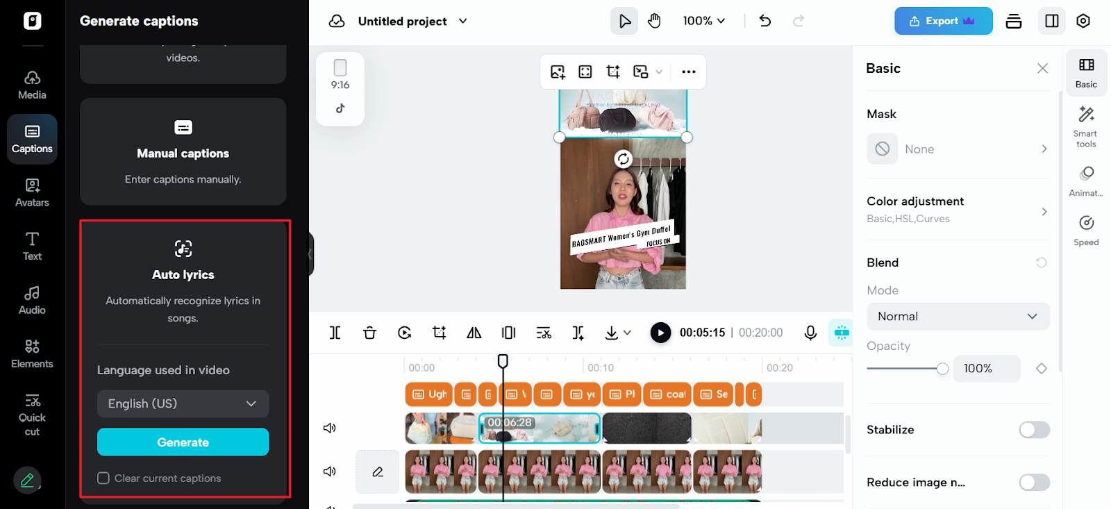 Next, navigate to the captions menu on the left panel. Click on the Auto Lyrics option, and watch the magic unfold. The software uses AI to automatically recognize the audio in your video and generate matching lyrics for it. These lyrics are synced with your audio track, without any external help required from you. Once the lyrics have been generated, make any necessary changes such as editing the text, colors or lyrics timing to align better with your preferences.
