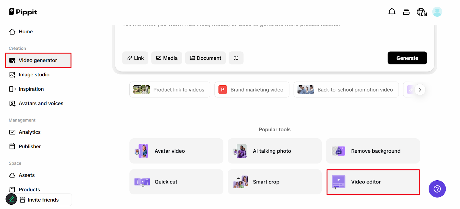 Get started with Pippit by logging into your account select the Video Generator section. From there, click on video editor to access the editing tools which will help you create stunning lyric videos. Click the upload button or drag and drop your video file directly into the timeline. You can add videos from your gallery, cloud storage etc.